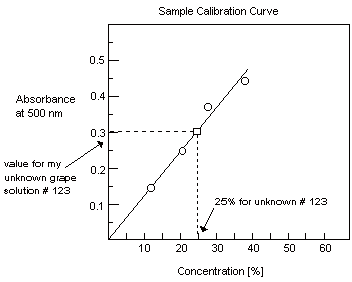 Next make a plot of the absorbance of the different standard grape pop solutions versus their concentrations, where four open circles indicate the measurements of the four known concentrations. One single straight line is drawn that comes the closest to all these circles. See below for an example. Note the equally spaced divisions, the straight line through the points and the title on the top. Now you can use this calibration plot to determine the concentration of your unknown grape pop solution. Find the concentration of your unknown by determining where its absorbance crosses the calibration line on your graph.