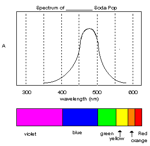 Plot the visible spectrum of the soda on graph paper. Your graph should fill the entire page and use accurate markings. All graphs should contain a title and appropriate labels on the axes. An example is shown below. Include the diagram indicating the wavelength regions and the corresponding colors of visible light. Use this diagram and plot to explain the origin of the color of the soda in your conclusion.